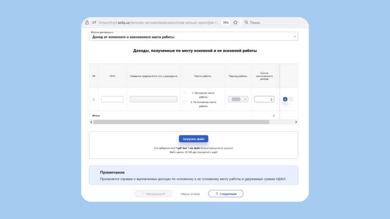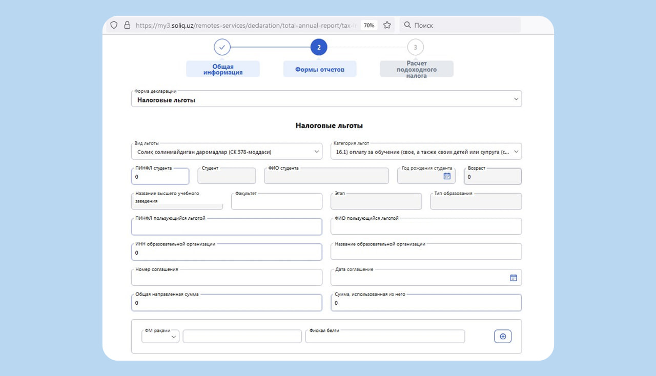 Размер возврата рассчитывают по формуле: сумма оплаченного контракта × 12%. Если контракт стоит 25 млн сумов, вернуть можно до 3 млн сумов — при условии, что с дохода был удержан НДФЛ в таком объеме.