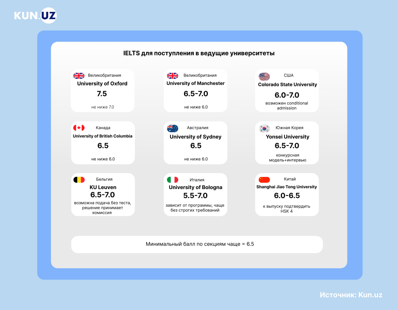 - Требования зарубежных университетов по IELTS находятся выше среднего уровня владения английским в Узбекистане.