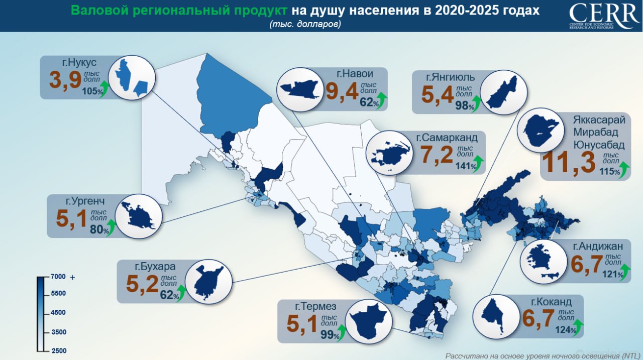 На уровне районов лидерами по росту стали Мирабадский, Яккасарайский и Чиланзарский районы Ташкента, где ВРП на душу населения превысил 10 тысяч долларов. Существенный рост также зафиксирован в Карманинском, Яшнабадском, Бектемирском, Сергелийском, Янги Хаетском и Мирзо-Улугбекском районах.