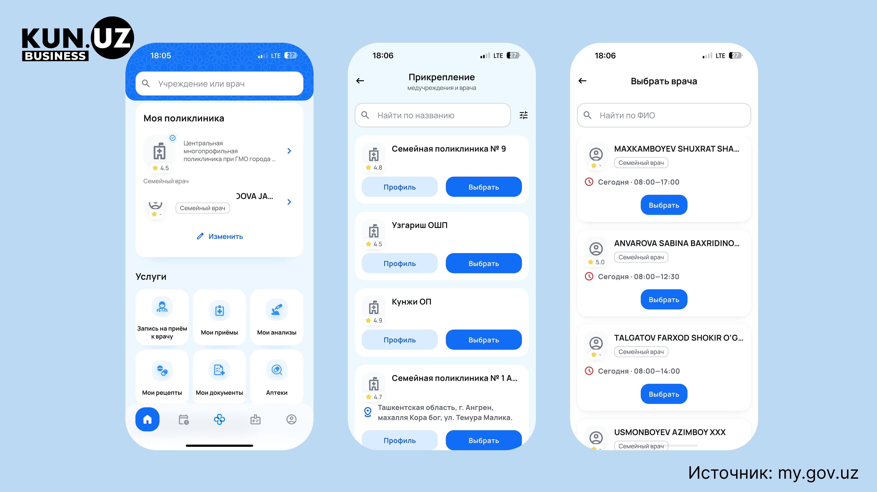 - Сменить поликлинику себе или ребёнку можно в my.gov.uz и в приложении Dmed.