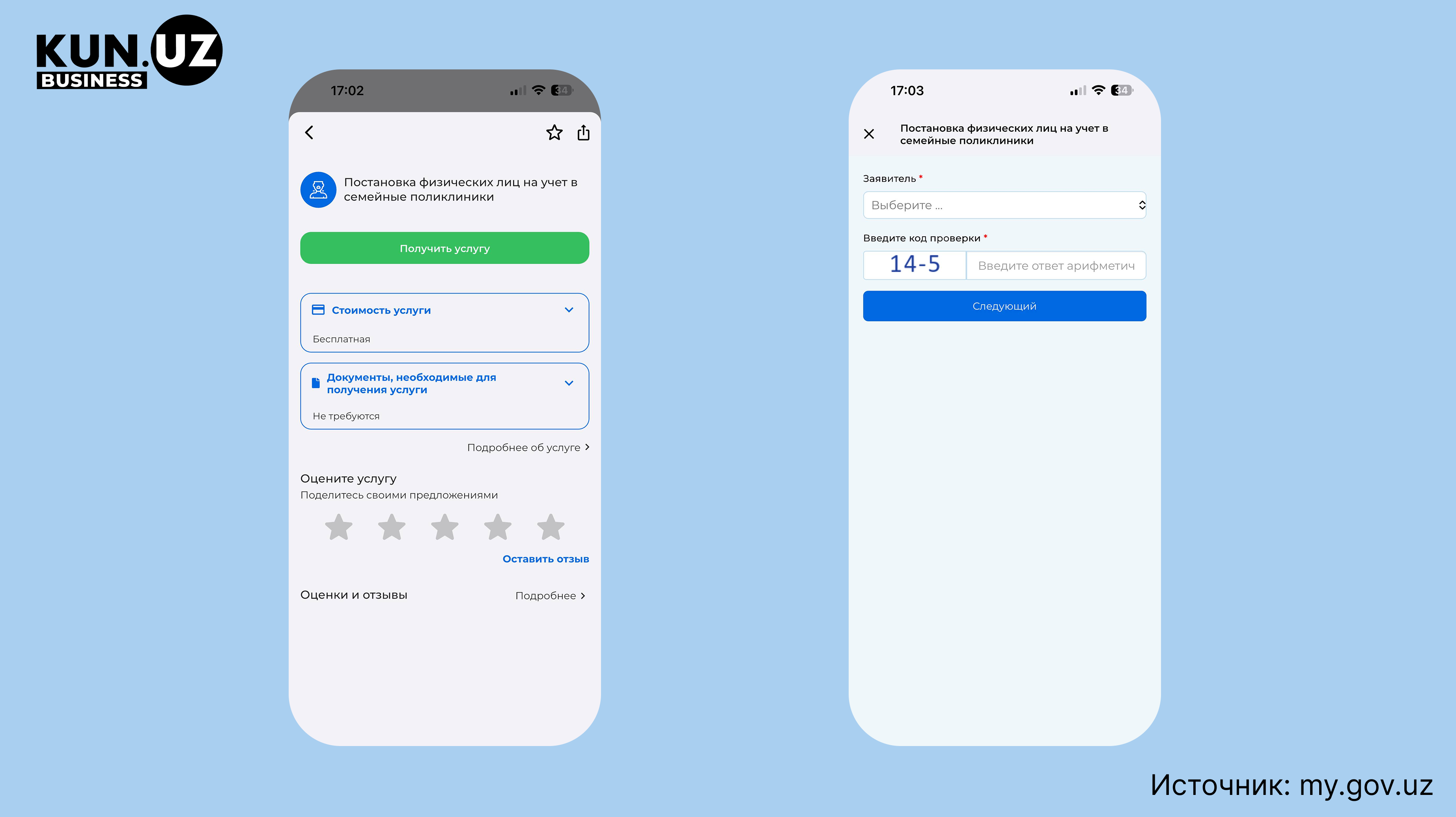 Войдите в my.gov.uz и откройте услугу «Постановка физических лиц на учет в семейные поликлиники». В графе Заявитель выберите своё имя или имя вашего ребенка.