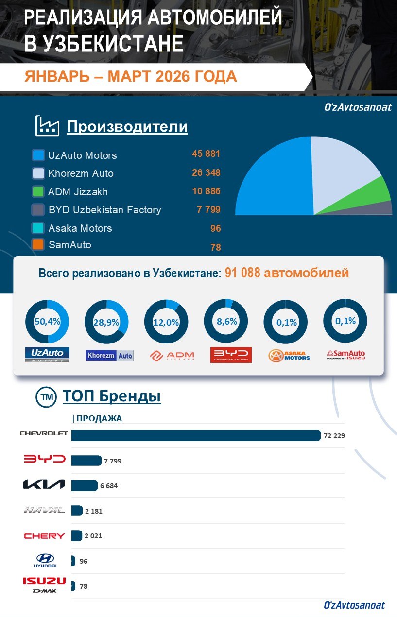 Предприятия автомобильной промышленности Узбекистана в первом квартале 2026 года продали 91 088 автомобилей — на 21 процент больше, чем годом ранее.