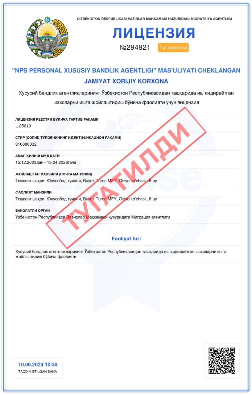 Агентство миграции при Кабинете Министров Республики Узбекистан аннулировало лицензию частного агентства занятости NPS Personal, осуществлявшего трудоустройство граждан за рубежом.