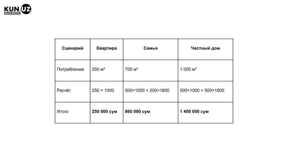 - 1400 сум за м³ — для отопления