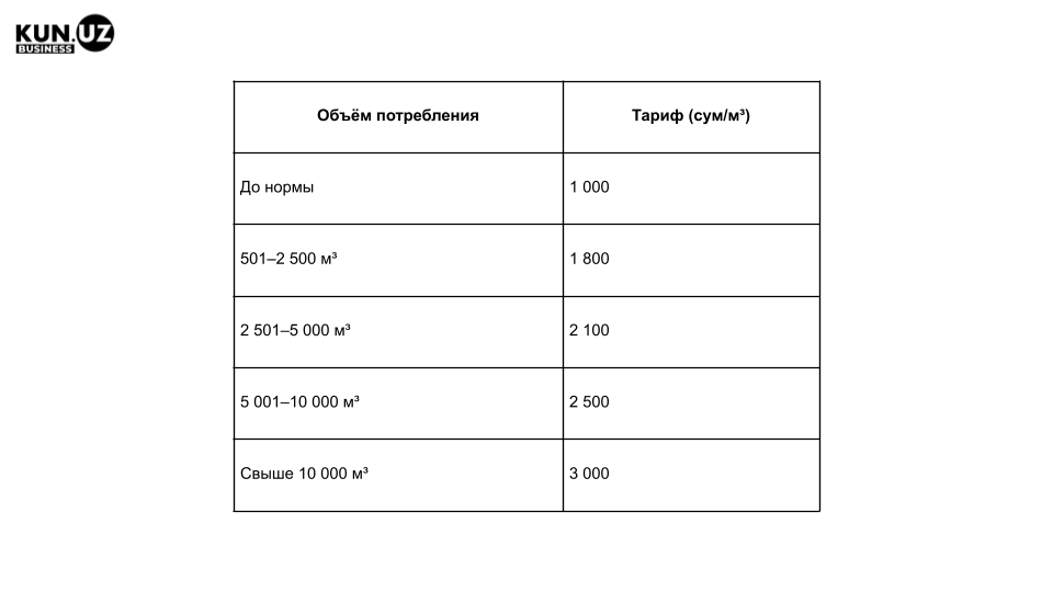 - Базовый тариф — 1000 сум за м³ в пределах нормы