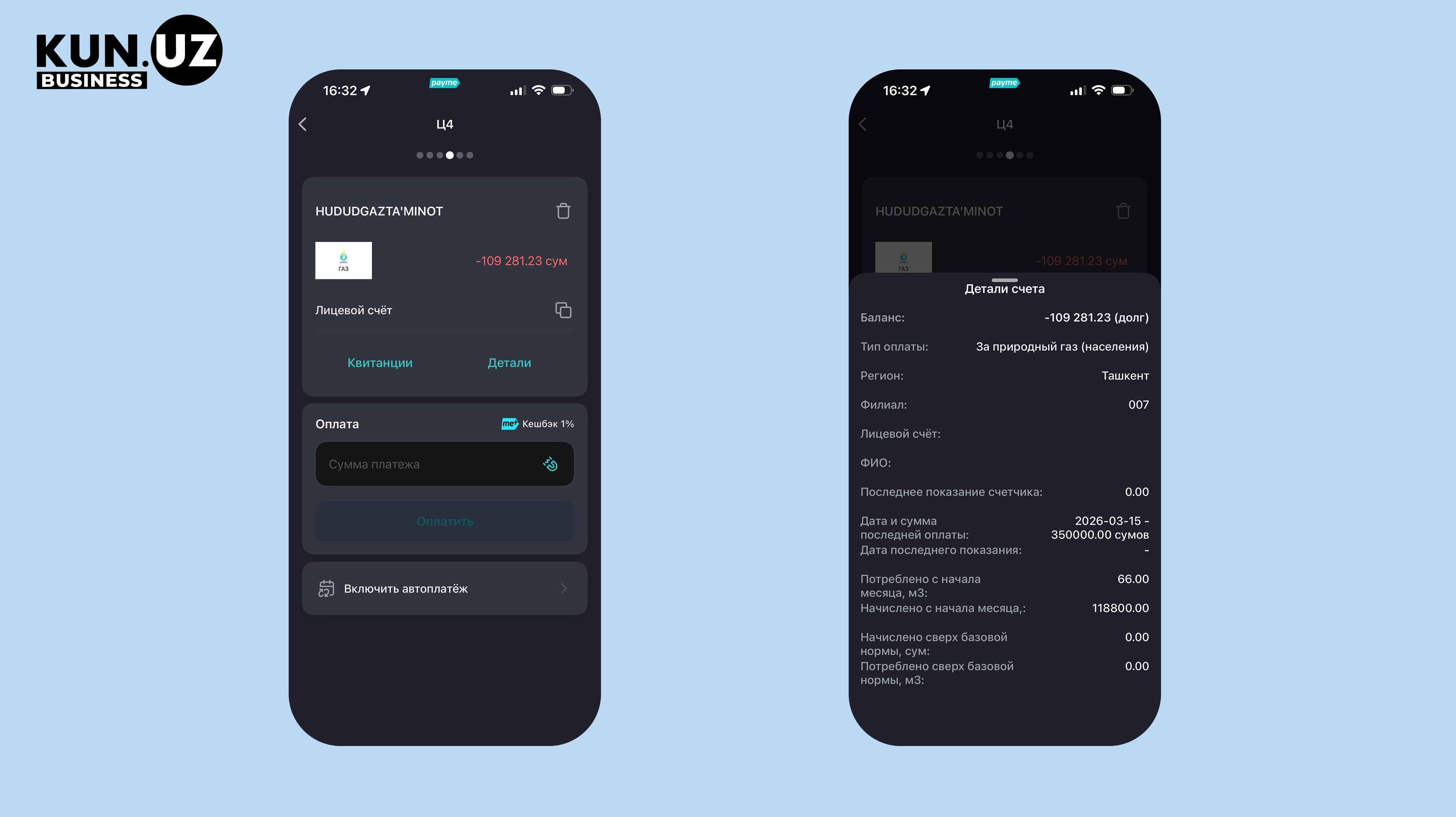 - Зайдите в личный кабинет через сайт или приложение Hudud Gaz Ta'minot ( Android и IOS)
