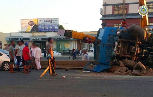 В Ташкенте автокран после столкновения с «Маздой» опрокинулся на автомобили